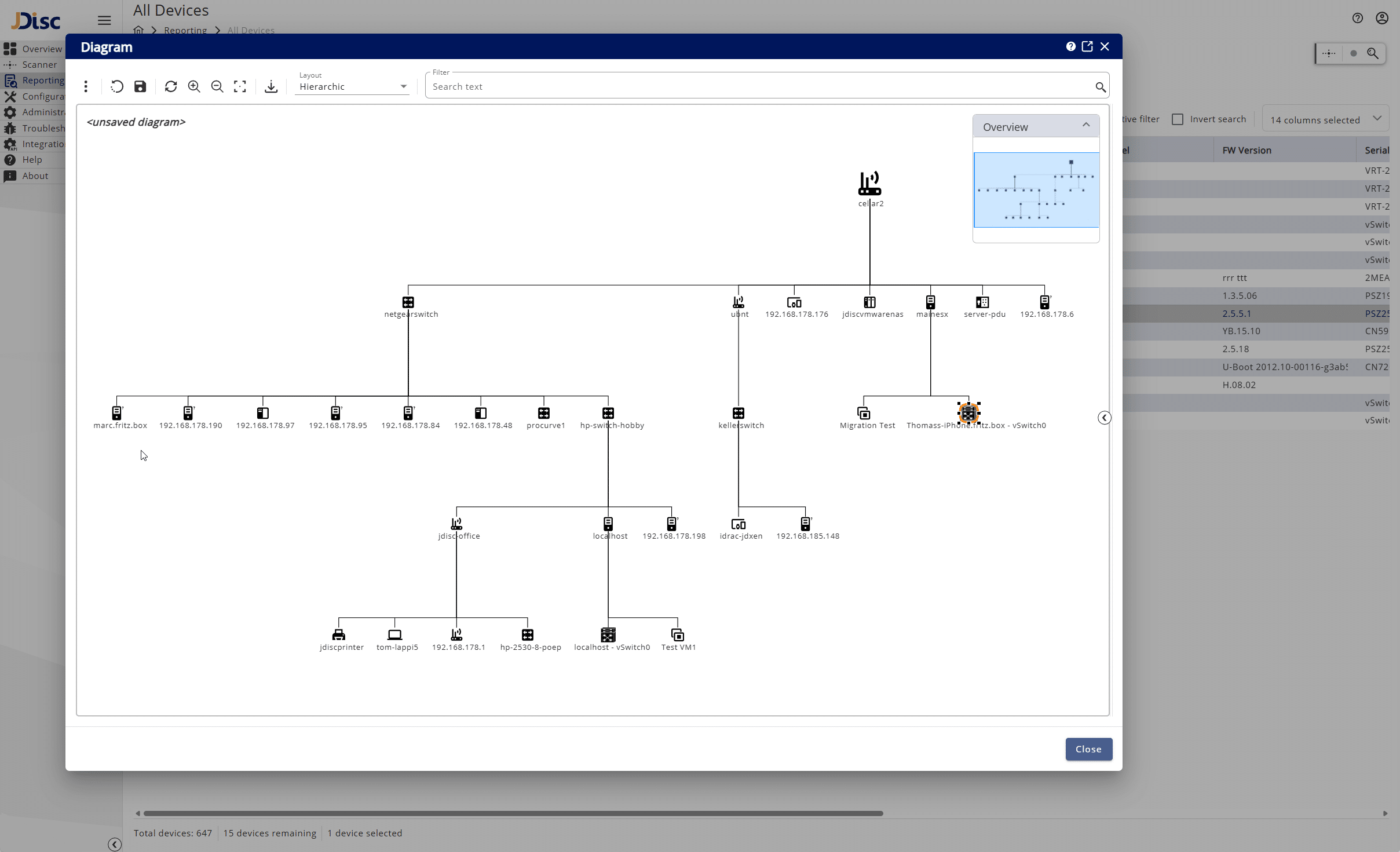 JDisc Discovery offers customizable reports and an intuitive wizard for generating tailored insights, ensuring IT teams can extract the exact information they need effortlessly. Below a sample of a network topology diagram showing how switchs and devices are connected to each other.