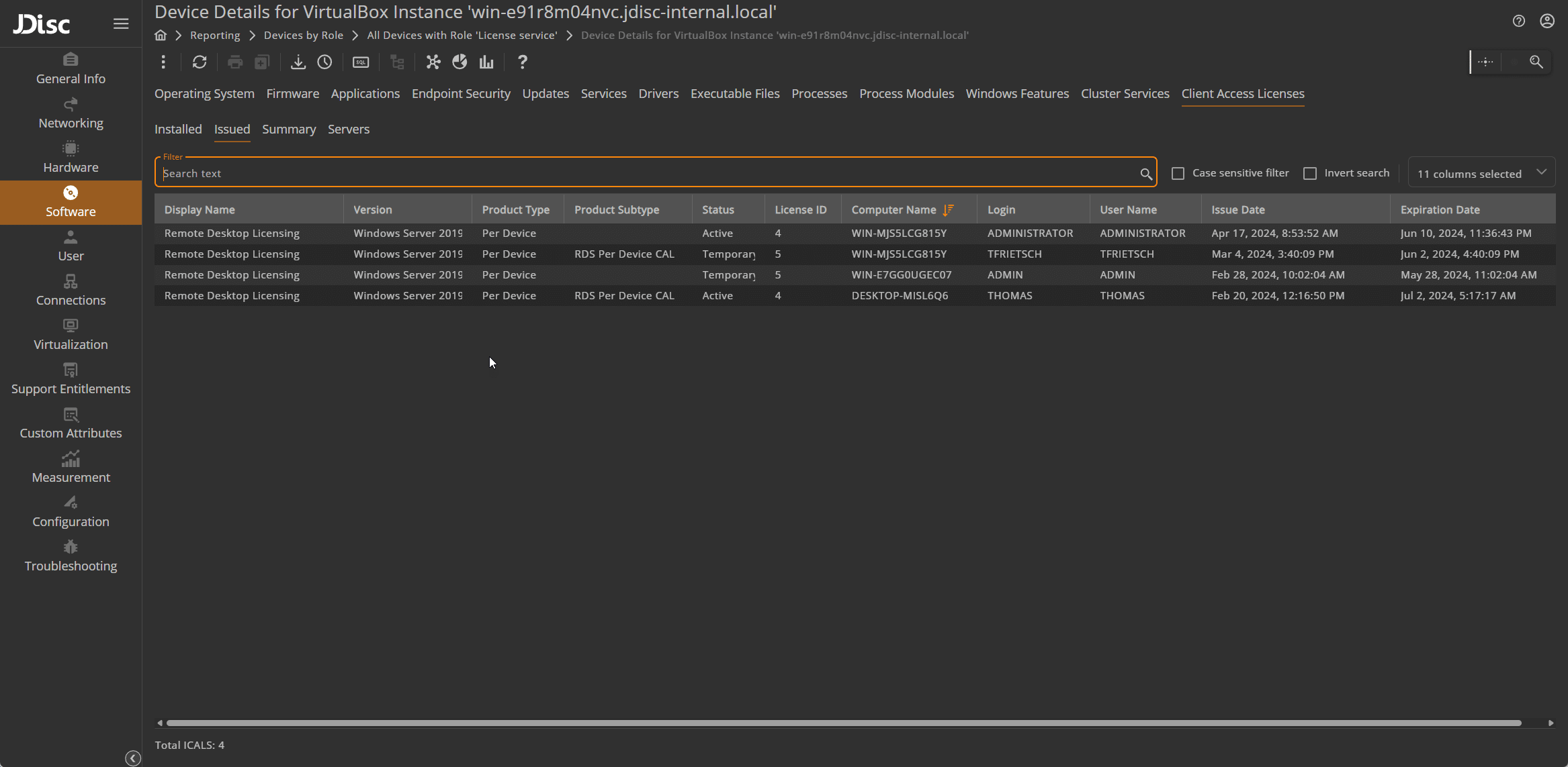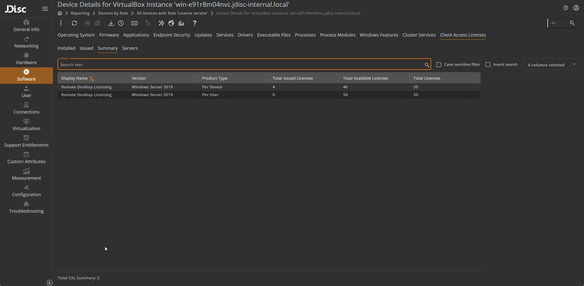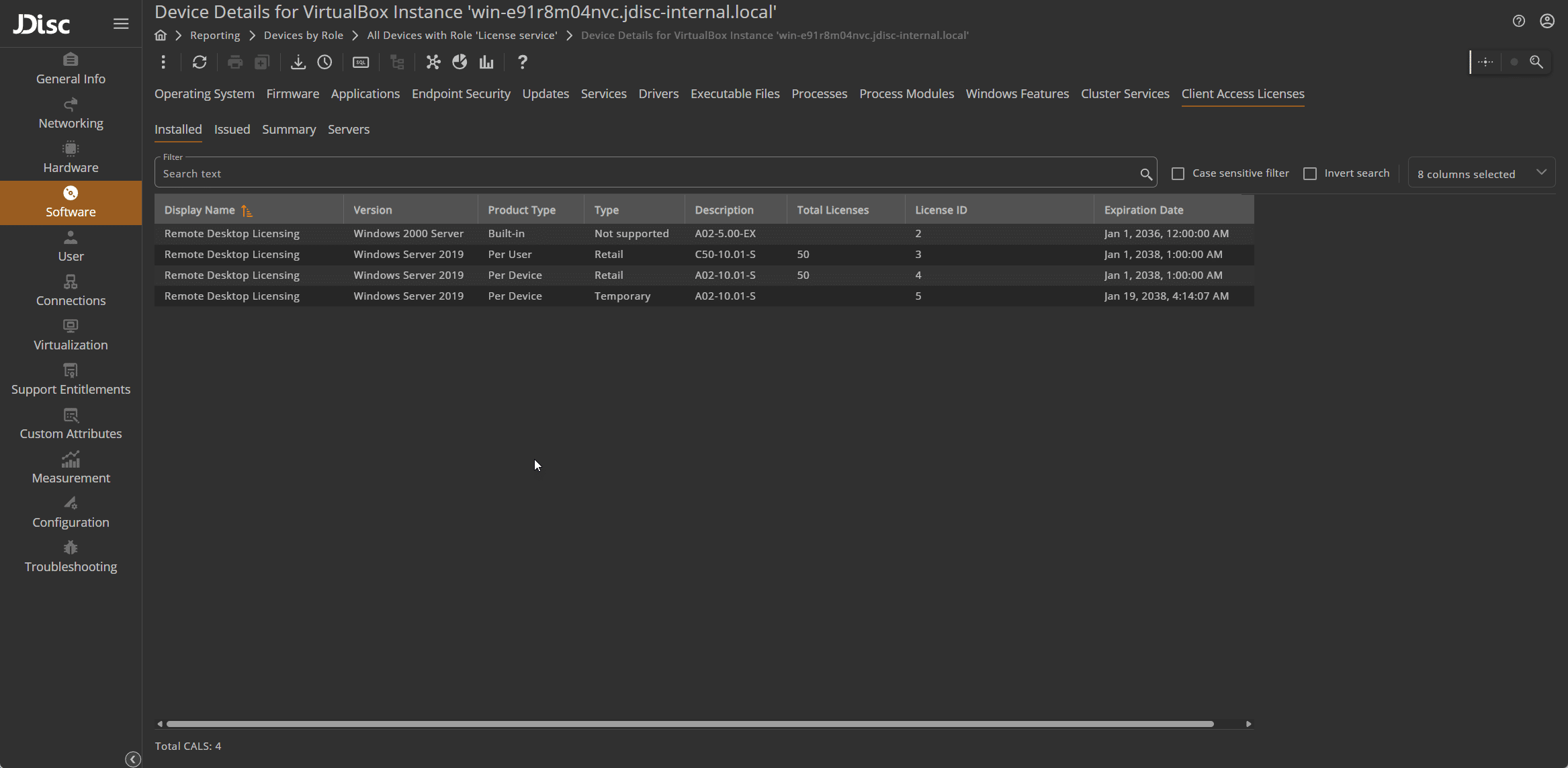 In addition to the list of installed licenses, JDisc Discovery also detects how the CAL licenses are being used for your software compliance checks: