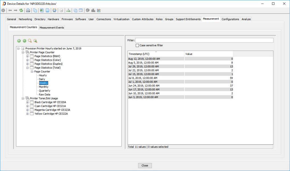 For most printers, we collect the number of printed pages (total, color, b&w, duplex) and toner/ink levels. Aggregations show the values on an hourly, daily, weekly, monthly, or quarterly base.