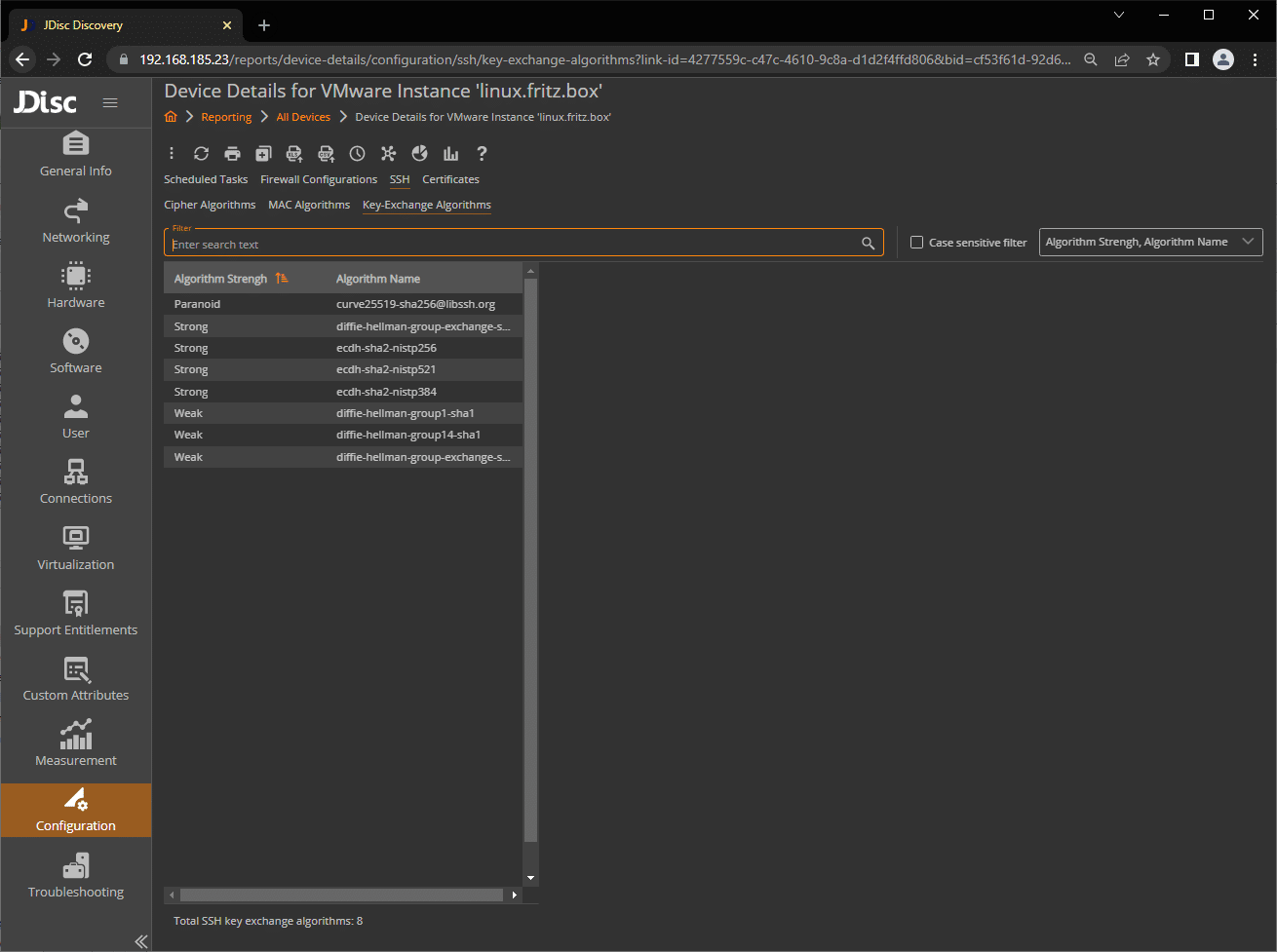 Gets the list of available SSH security algorithms. Identify obsolete and weak encryption algorithms offered by your SSH serves within seconds.